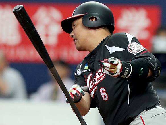投手 金子千尋 6番 ナバーロ 空三振 外角のチェンジアップに空振り三振 1アウト |