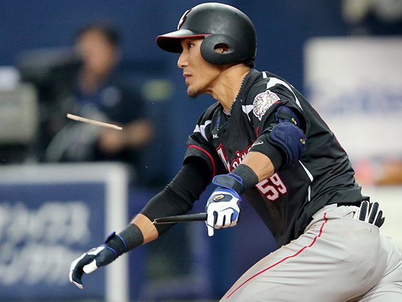 甘い球を振り抜き左中間に適時二塁打を放ったデスパイネ