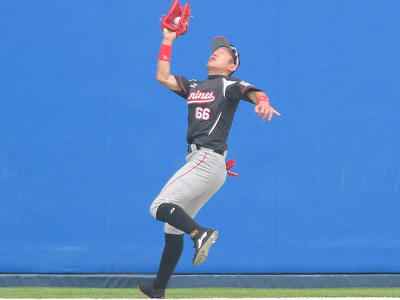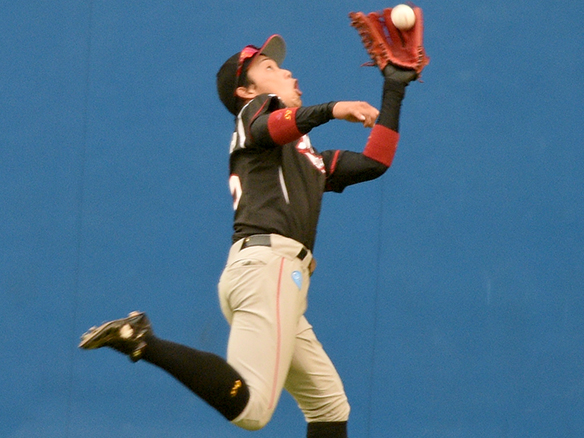 岡田はセンターへの深い当たりを懸命に走り捕球した