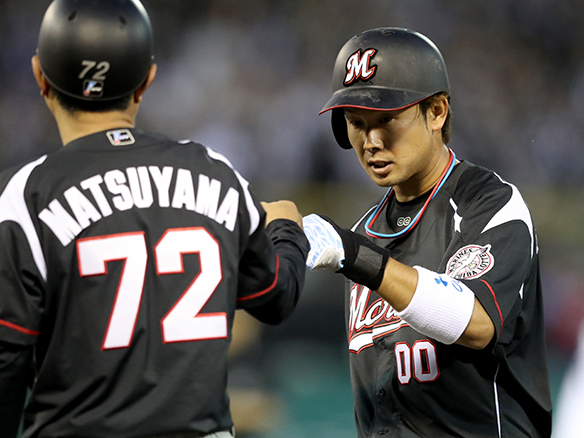 3番 角中 中安 ランナー2塁からセンターへの先制タイムリーヒット! 中0-1ロ 1塁 ![]() 0