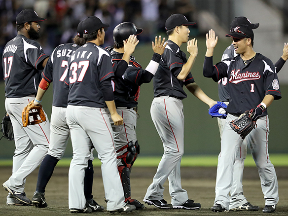 勝利しハイタッチを交わすナイン