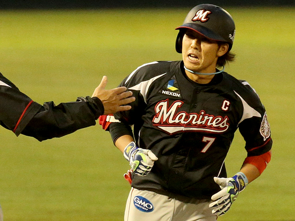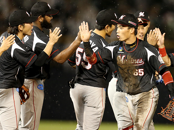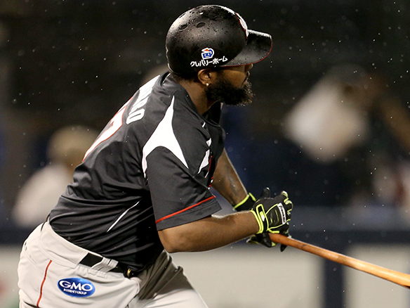 投手 武隈 5番 ナバーロ 左安 ランナーフルベースの1-0からレフトへのタイムリーヒットでロッテ逆転! 西5-6ロ 1,2塁 ![]() 5