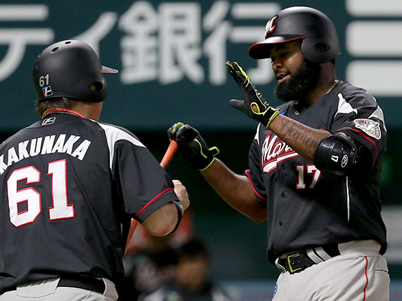 5番 ナバーロ 中本 カウント2-0からバックスクリーンへの2ランホームランでロッテ先制! ソ0-2ロ ![]() 0