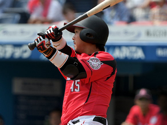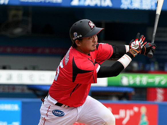 6番 園部 左安 レフトへのヒットを放つ 1塁 |