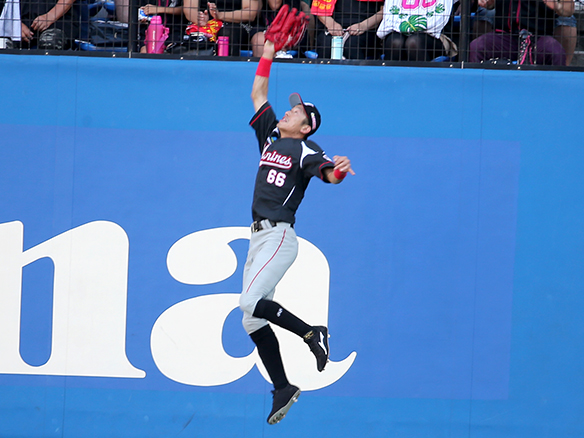 6番 根元 左邪飛 ファウルフライをペゲーロ(左)が捕球してバッターアウト 3アウトチェンジ |