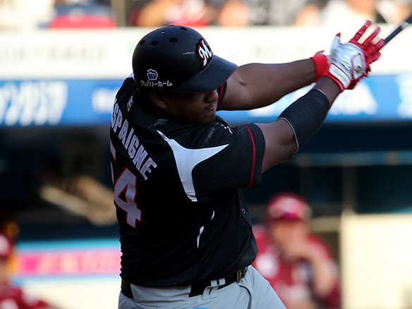 4番 ペゲーロ 左安 ランナー1塁 内角高めのストレートをレフトへ打ってヒット |