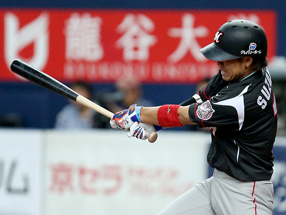 一塁手の横を抜けるタイムリーを放つ鈴木