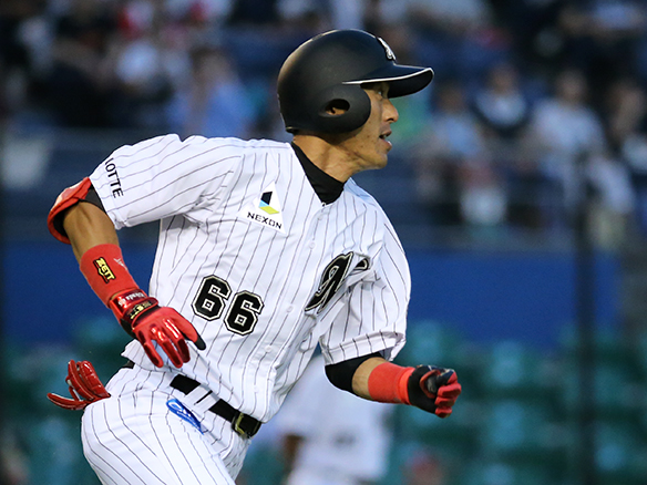 投手 イ・デウン 2番 茂木 中越二 150キロの外角のストレートをセンターへ打ってツーベース |