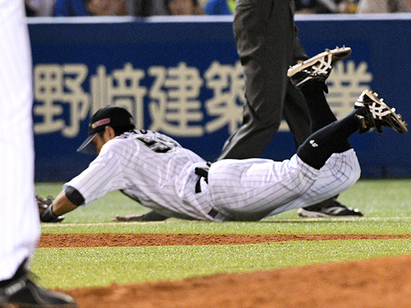 細谷が3塁線の鋭い打球を好プレーでアウトにする!