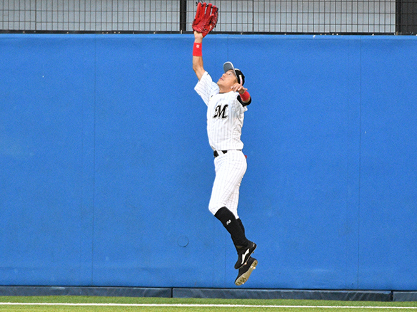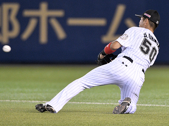 懸命に走り最後はジャンプしフライを捕球した岡田