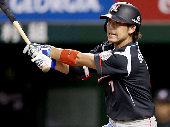 7番 栗山 左安 外角のカーブをレフトへ打ってヒット  |