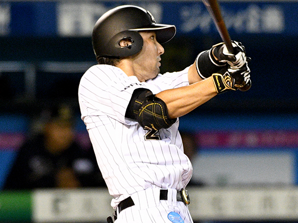 ピッチャーへ鋭いゴロを打ち返した荻野貴