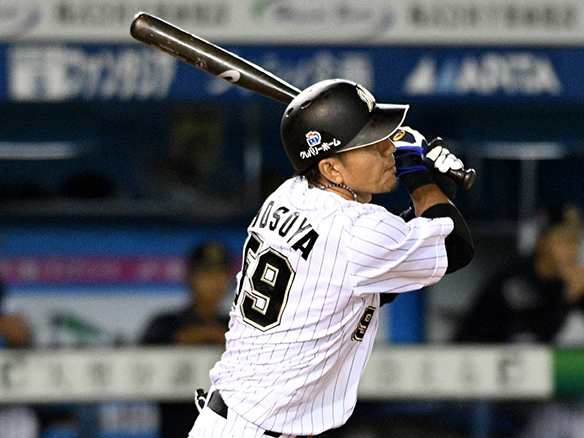 1番 荻野貴 中安 ランナー1塁 外角低めのフォークをセンターへ打ってヒット 1,3塁  |