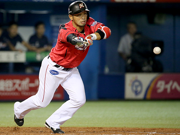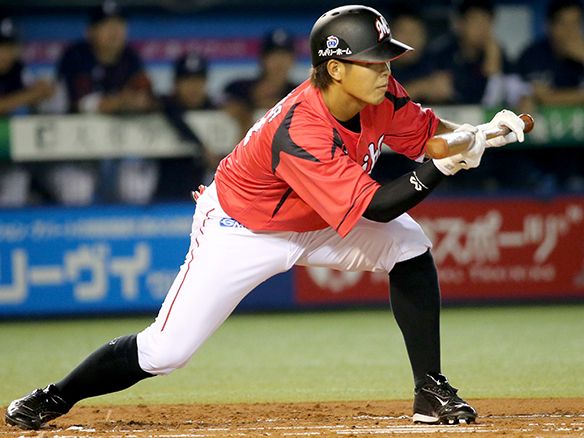 ボールの勢いを殺してバントを成功させた中村