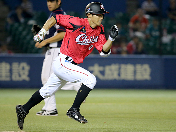 角中(左)の送球ミスにより出塁する 2,3塁  |