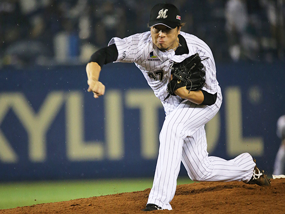 投手 岸 4番 井口 見三振 内角のカーブを見逃し三振 1アウト  |