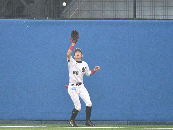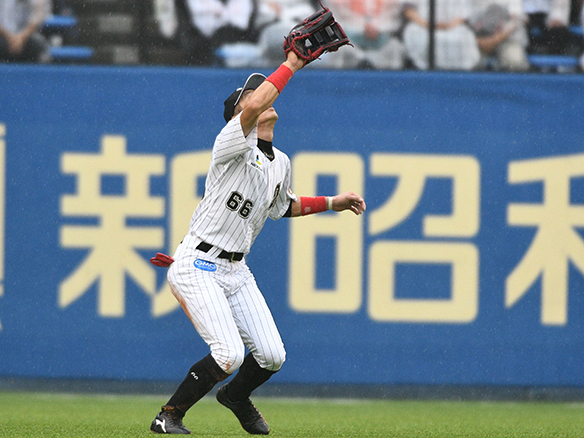 懸命に前進し雨空に高く上がった打球を捕球する岡田