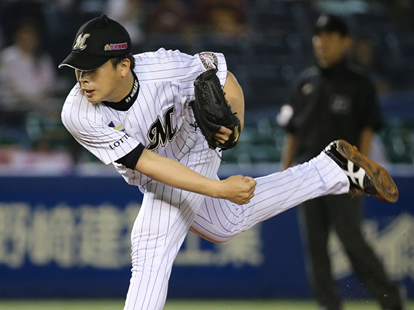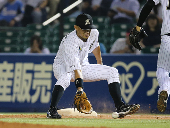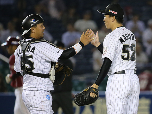 投手 南 投手交代:益田 守備交代:キャッチャー田村 守備変更:大嶺翔→セカンド ロッテDH解除 |