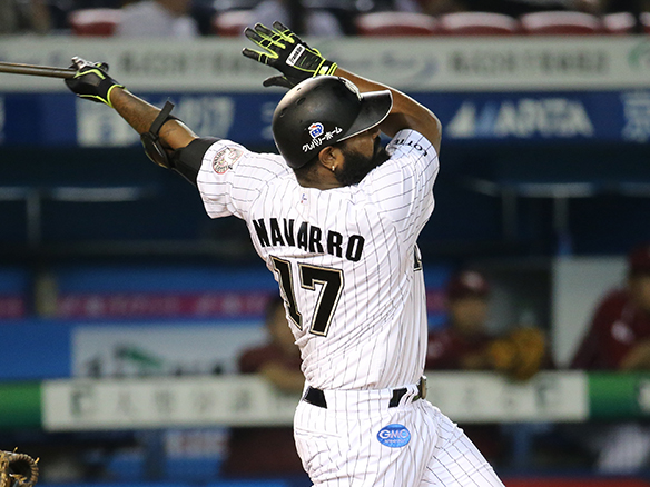 ナバーロはフェンス間際の大飛球を放つも中飛に終わる