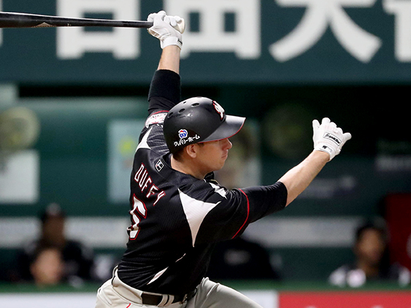 6番 ダフィー 四球 フォアボールを選ぶ 1,2塁 |