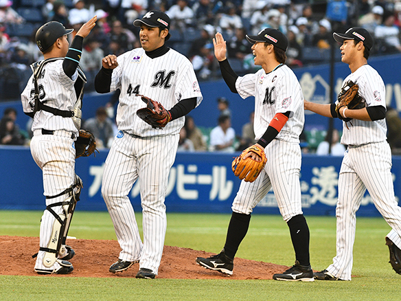 待望の今季白星を挙げ、ナインは歓喜のハイタッチをかわす!