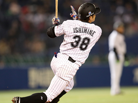 1番 伊志嶺 中安 ランナー2塁 内角のストレートをセンターへ勝ち越しタイムリーヒット! 1塁 ロ2-1西 ![]() 2