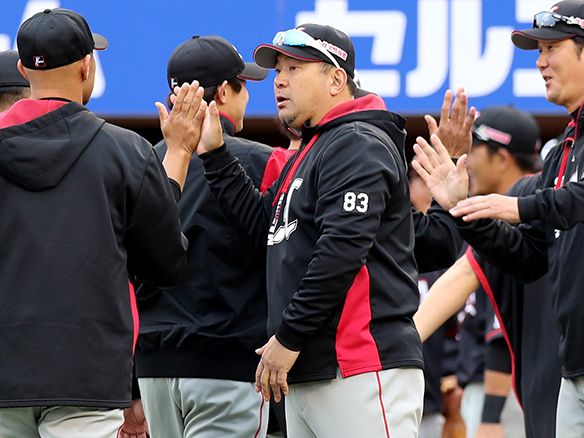 試合に勝利し、選手を出迎える伊東監督