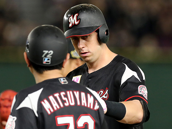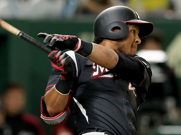 5番 レアード 左安 ランナー1,2塁 高めのストレートをレフトへ勝ち越しタイムリーヒット! 1,2塁 日3-2ロ ![]() 3