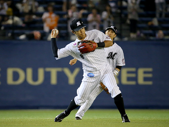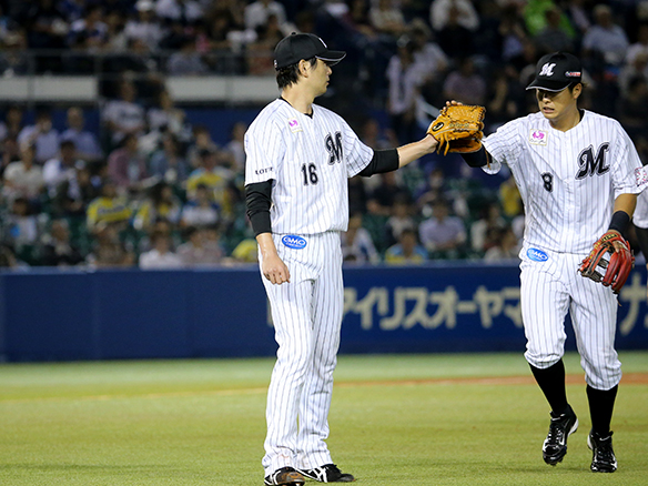 併殺を完成させた中村とタッチを交わす涌井