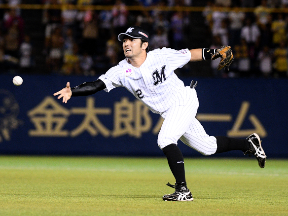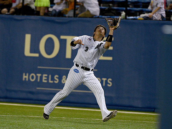ファウルゾーンまで打球を追いかけて捕球する角中