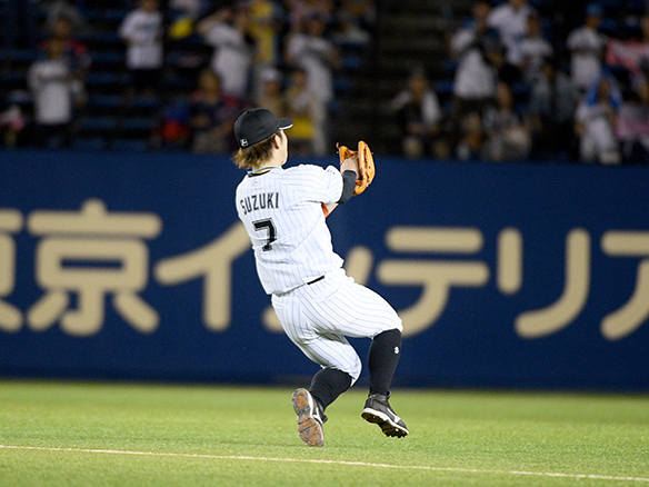 鈴木が難しい飛球を後ろ向きでキャッチする
