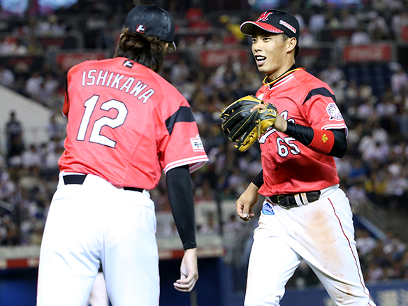 投手 松永 守備変更:加藤→ライト 守備変更:荻野→センター 守備変更:細谷→レフト 守備変更:三木→ファースト |