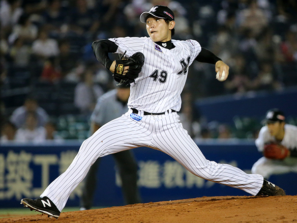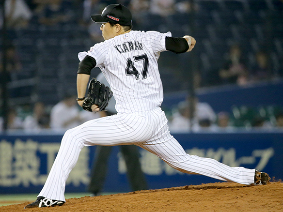 投手 金子千尋 7番 高濱 空三振 外角低めのフォークを空振り三振 1アウト |