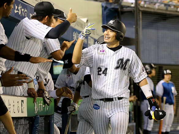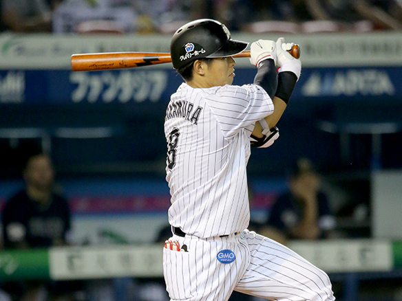 3番 吉田正 中安 ランナー1,2塁 外角高めのストレートをセンターへ勝ち越しタイムリーヒット! 1,2塁 ロ2-3オ ![]() 2