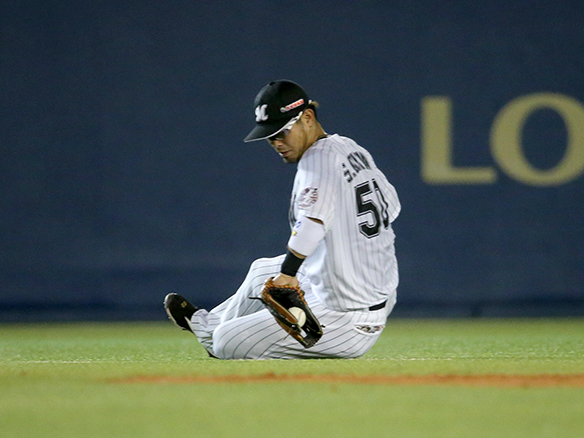 投手 チェン 5番 中島 空三振 内角低めのスライダーを空振り三振 1アウト |