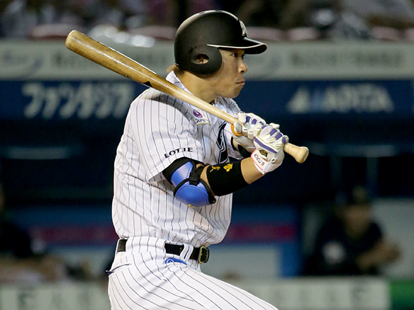 5番 中島 左安 ランナー1,2塁 内角低めのフォークをレフトへ先制タイムリーヒット! 1,2塁 ロ0-1オ ![]() 0