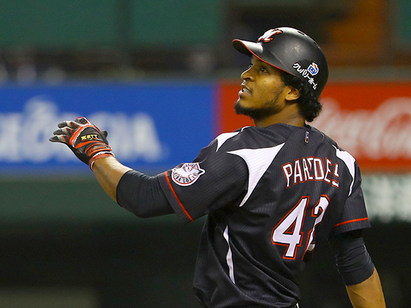 1番 パラデス 左本 ランナー2塁 カウント1-0からレフトスタンドへ2ランホームラン! 西4-7ロ ![]() 4