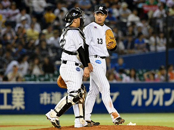 投手 モイネロ 投手 岩嵜 守備変更:高田→セカンド 守備変更:高谷→キャッチャー 守備変更:岩嵜→ピッチャー |