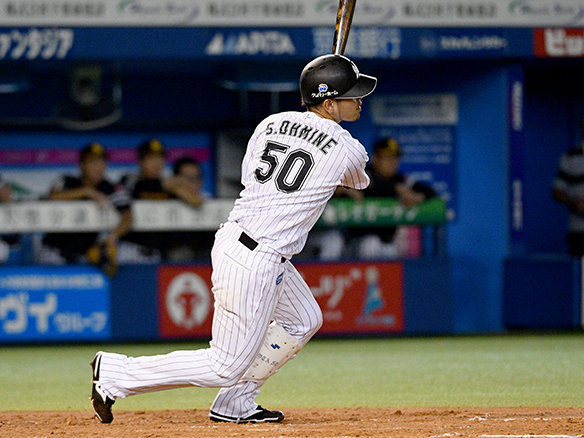 7番 上林 左安 内角低めのストレートをレフトへ打ってヒット 1塁 |