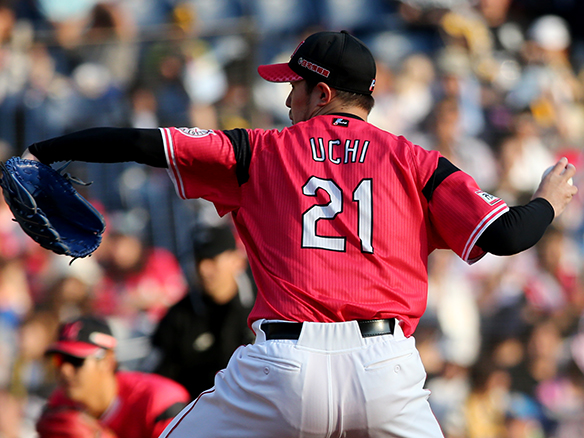 投手 涌井 1番 明石 左飛 外角のストレートを打つもレフトフライ 1アウト |