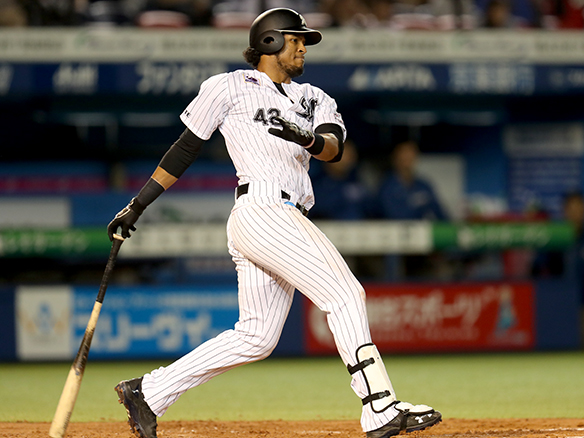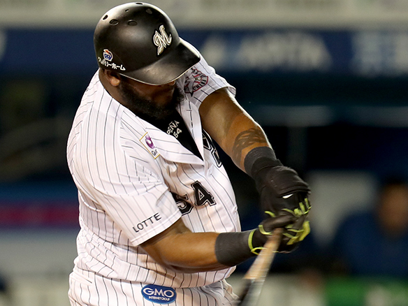 5番 レアード 遊失 大嶺翔(遊)の悪送球により進塁する 3塁 ロ3-3日 ![]() 3