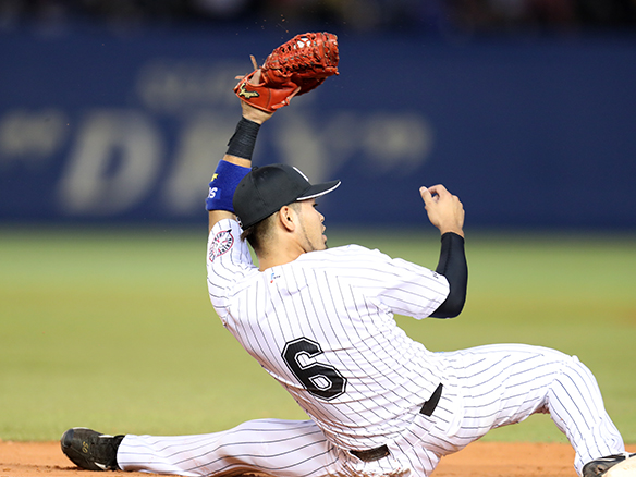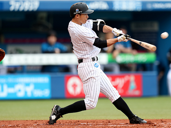 荻野貴がレフトフェンスを直撃する二塁打で先制のチャンスを作る
