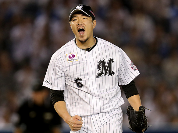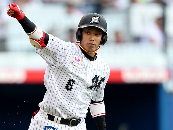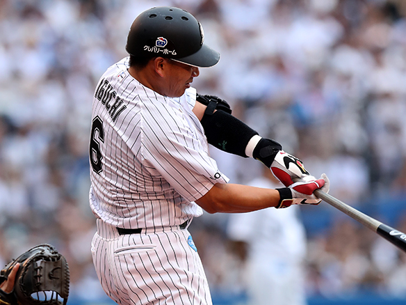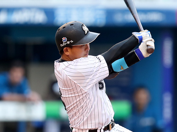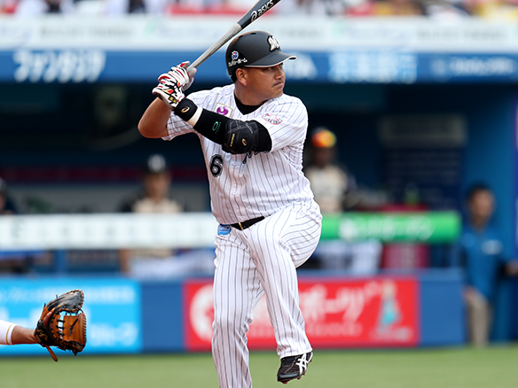 5番 レアード 中安 ランナー1,2塁 低めのストレートをセンターへ勝ち越しタイムリーヒット! ロ1-2日 ![]() 1