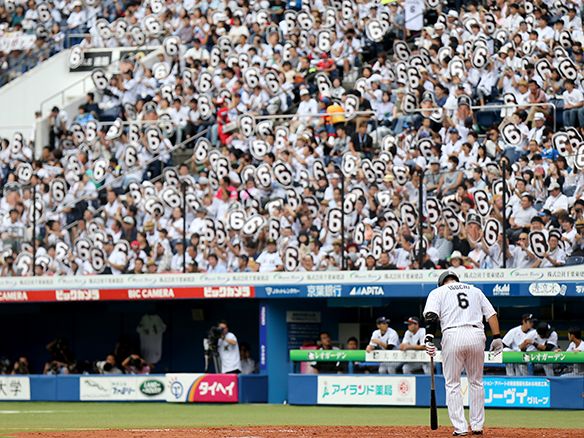 ファンが背番号6の応援ボードを掲げる中、井口が打席に入る