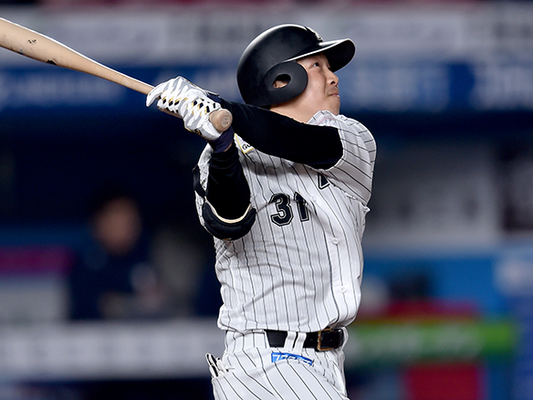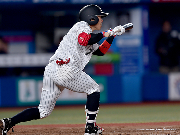 2死満塁で菅野がフェンス直撃の適時三塁打を放つ