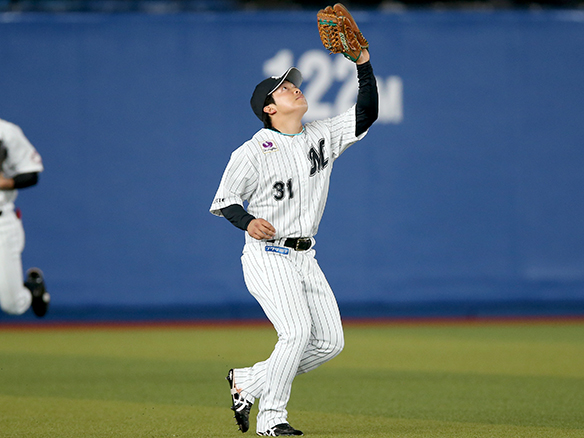 レフトの菅野が捕球体勢に入る