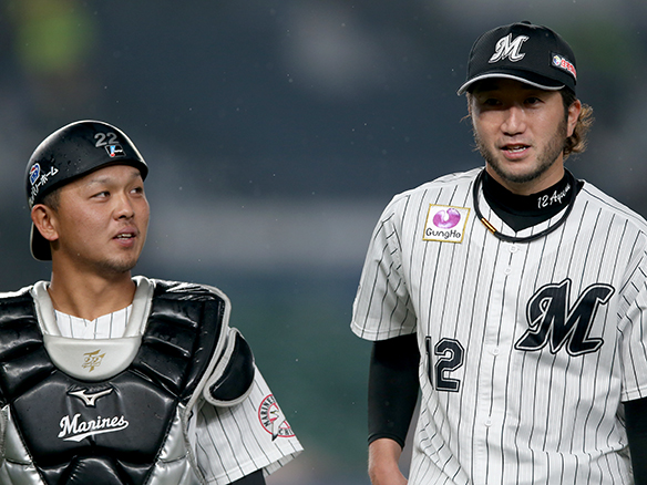 この回を無失点でしのいだ石川と捕手の田村