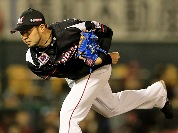 投手 岸 7番 福浦 中飛 内角低めのスライダーを打つもセンターフライ 1アウト  |