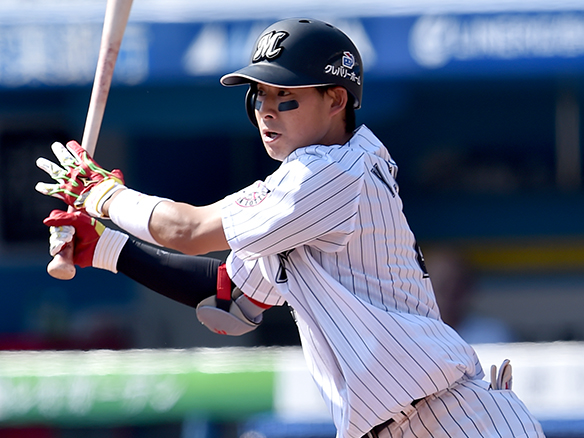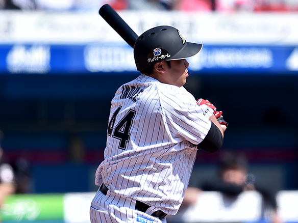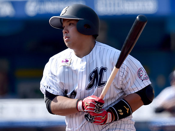 7番 石井一 左安 外角のストレートをレフトへ打ってヒット 1塁  |