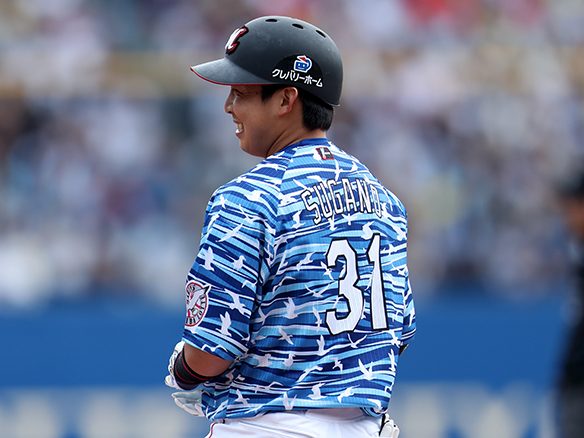 左前2点適時打で先制点を挙げた菅野は笑顔を見せる